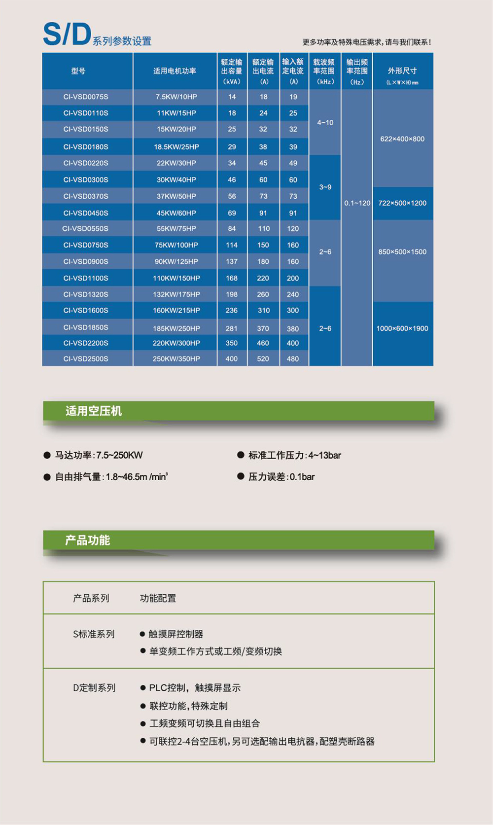 該系統適應于所有螺桿式、活塞式、滑片式、離心式壓縮機,采用PLC控制系統,集成空氣壓縮機的控制與變頻控制于一體,自帶空氣壓縮機控制系統,在與空壓機聯接時,不用更改原來的線路,即使該系統出現問題時,您還可以采用原來的工頻控制,讓您的變頻改造沒有任何一點風險。改造后空壓機與原廠變頻空壓機只存在電機的區別。